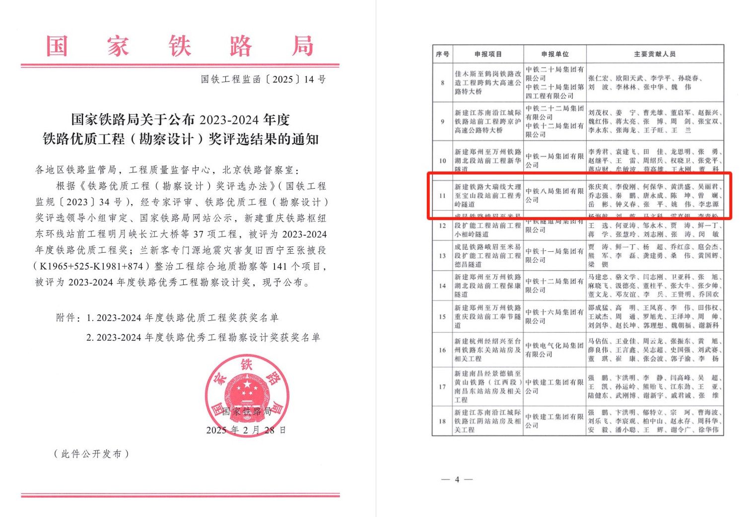近日,從國(guó)家鐵路局傳來喜報(bào),由集團(tuán)公司承建的大(理)瑞(麗)鐵路大理至保山段(以下簡(jiǎn)稱“大瑞鐵路大保段”)秀嶺隧道工程,喜獲2023-2024年度鐵路優(yōu)質(zhì)工程獎(jiǎng)。