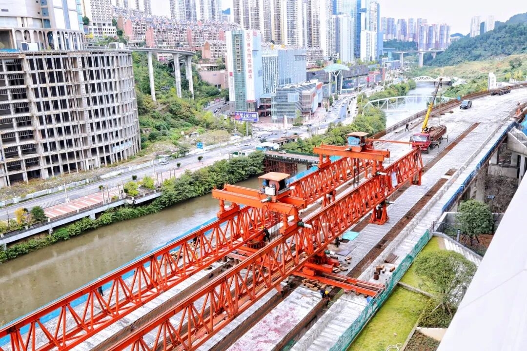 ??10月15日,隨著架橋機(jī)將最后一片重達(dá)140噸的預(yù)制小箱梁精準(zhǔn)放至橋墩支座,由集團(tuán)公司承建的貴陽(yáng)市南明區(qū)濱河路道路工程(一期)項(xiàng)目順利完成全部橋梁主體結(jié)構(gòu),正式進(jìn)入橋面系施工新階段。